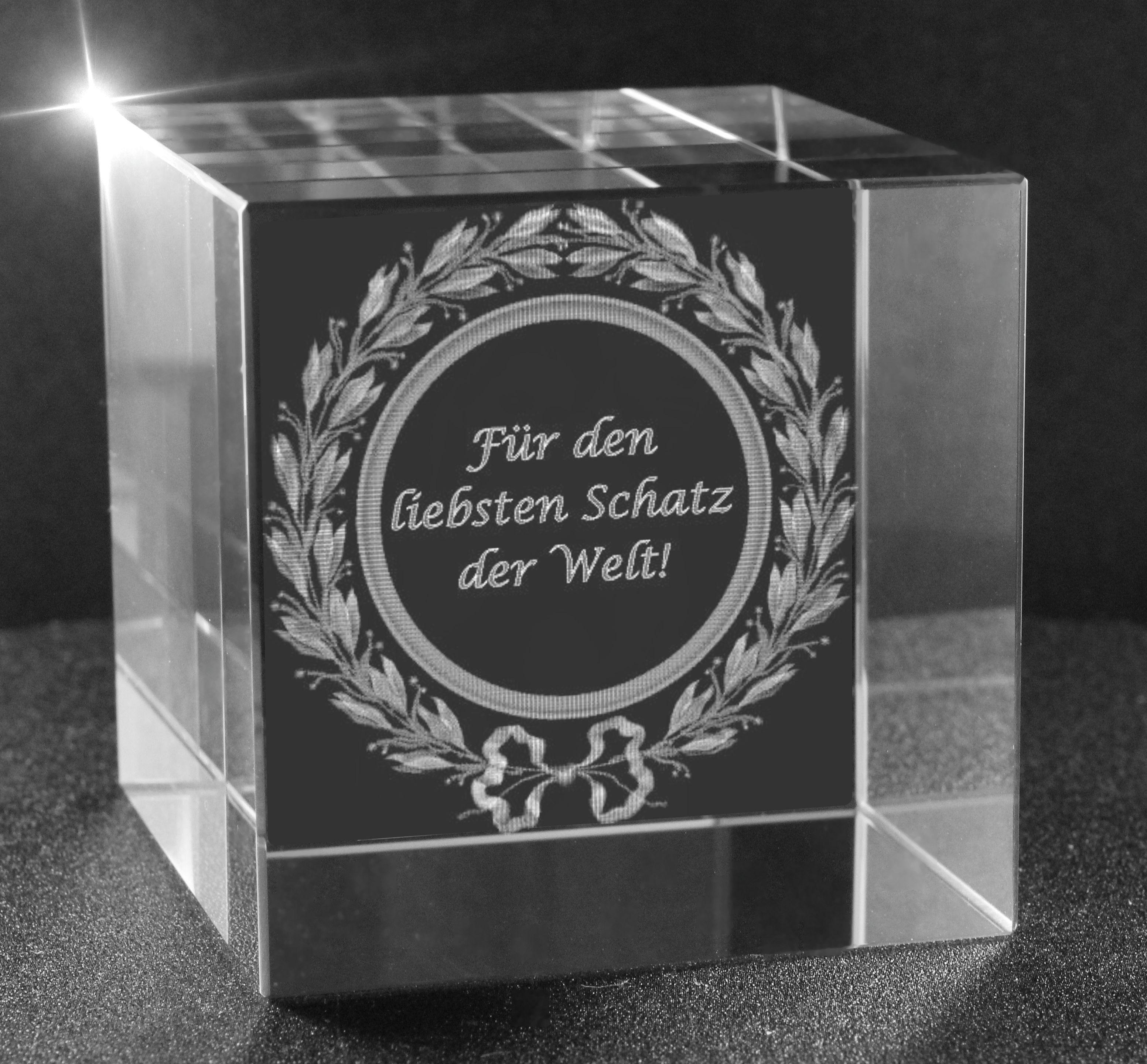 Produktinformationen "3D Glaswürfel Motiv: Lorbeerkranz Für den liebsten Schatz der Welt"