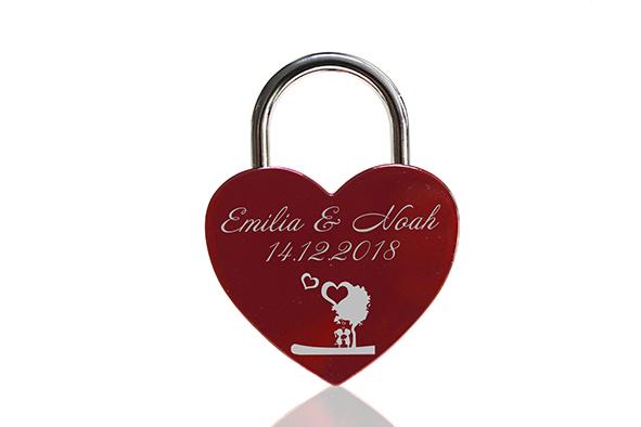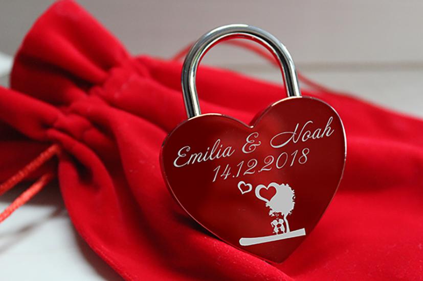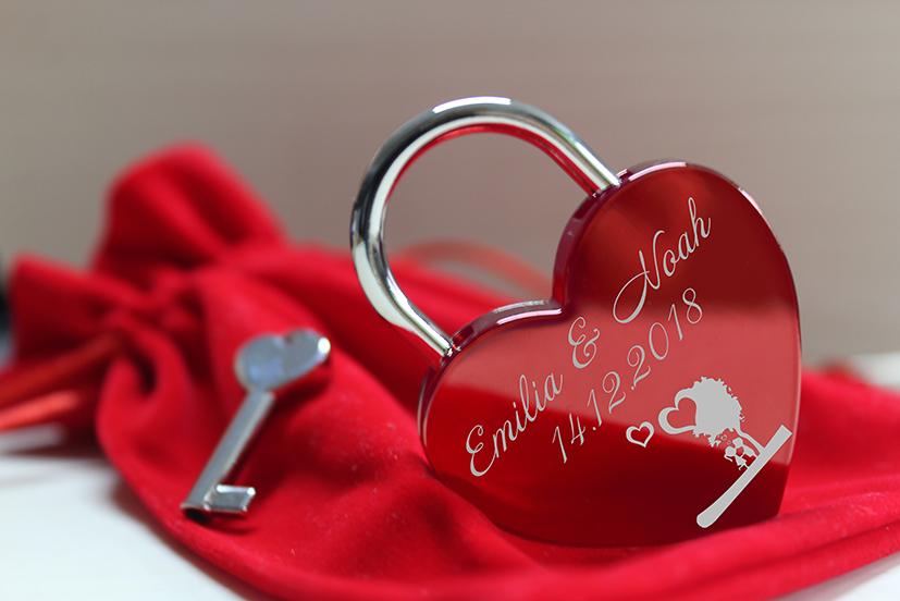 - Die Liebesschlösser werden mit einem universellen Schlüssel mit einer hochwertigen und individuellen Lasergravur (einseitig) geliefert. Die Gravur erfolgt auf der Rückseite des Schlosses, so dass der meiste Platz genutzt werden kann. So wird das Schloss auch ein schönes Geschenk zur Hochzeit oder zur Verlobung.