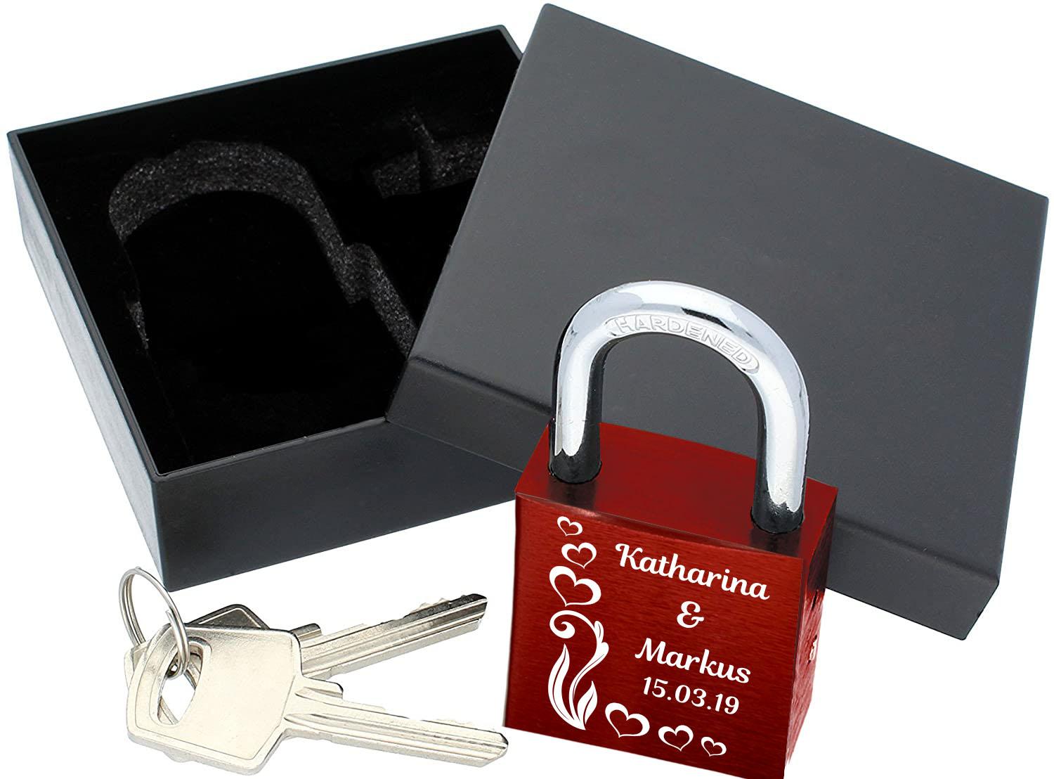 Das Liebesschloss in der Farbe Rot wird mit unseren Lasern mit Deinen Angaben graviert. Wir gravieren Deinen Namen + Datum oder kleinen Wunschtext zu dem bestehenden Motiv ein.