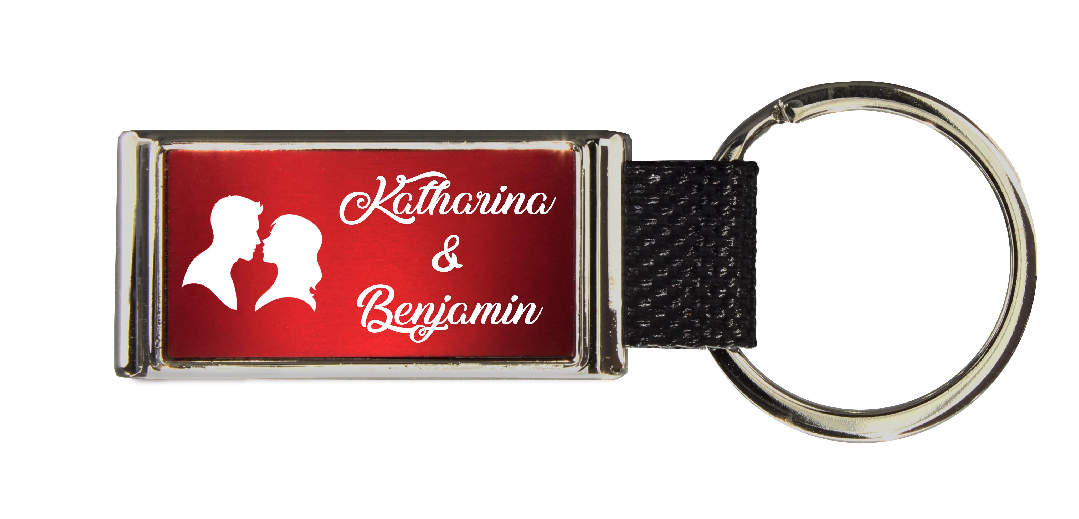 Metall-Schlüsselanhänger Glory - mit einem rot eingelassenen Plättchen und Deinen Wunschnamen graviert