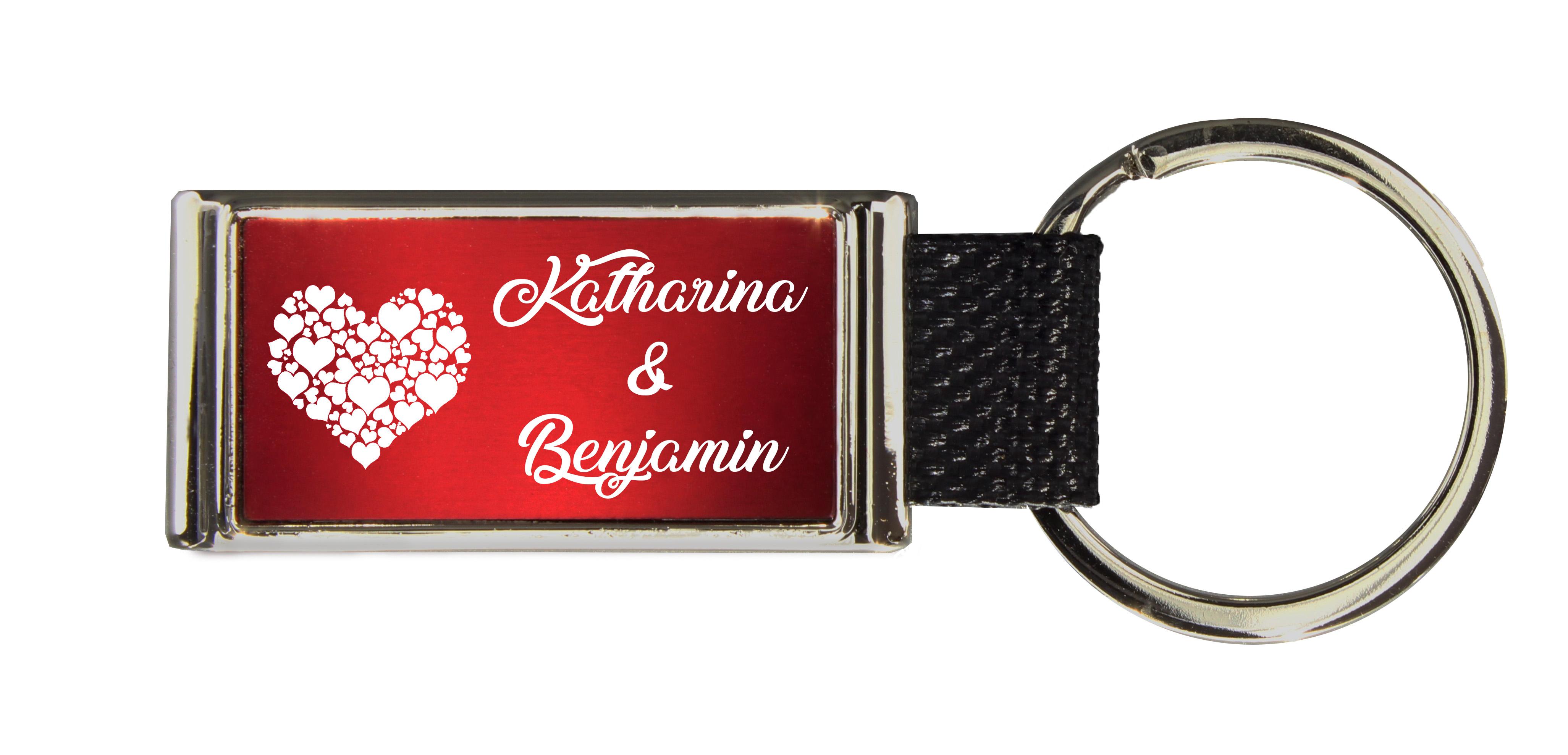 Metall-Schlüsselanhänger Glory - mit einem rot eingelassenen Plättchen und Deinen Wunschnamen graviert
