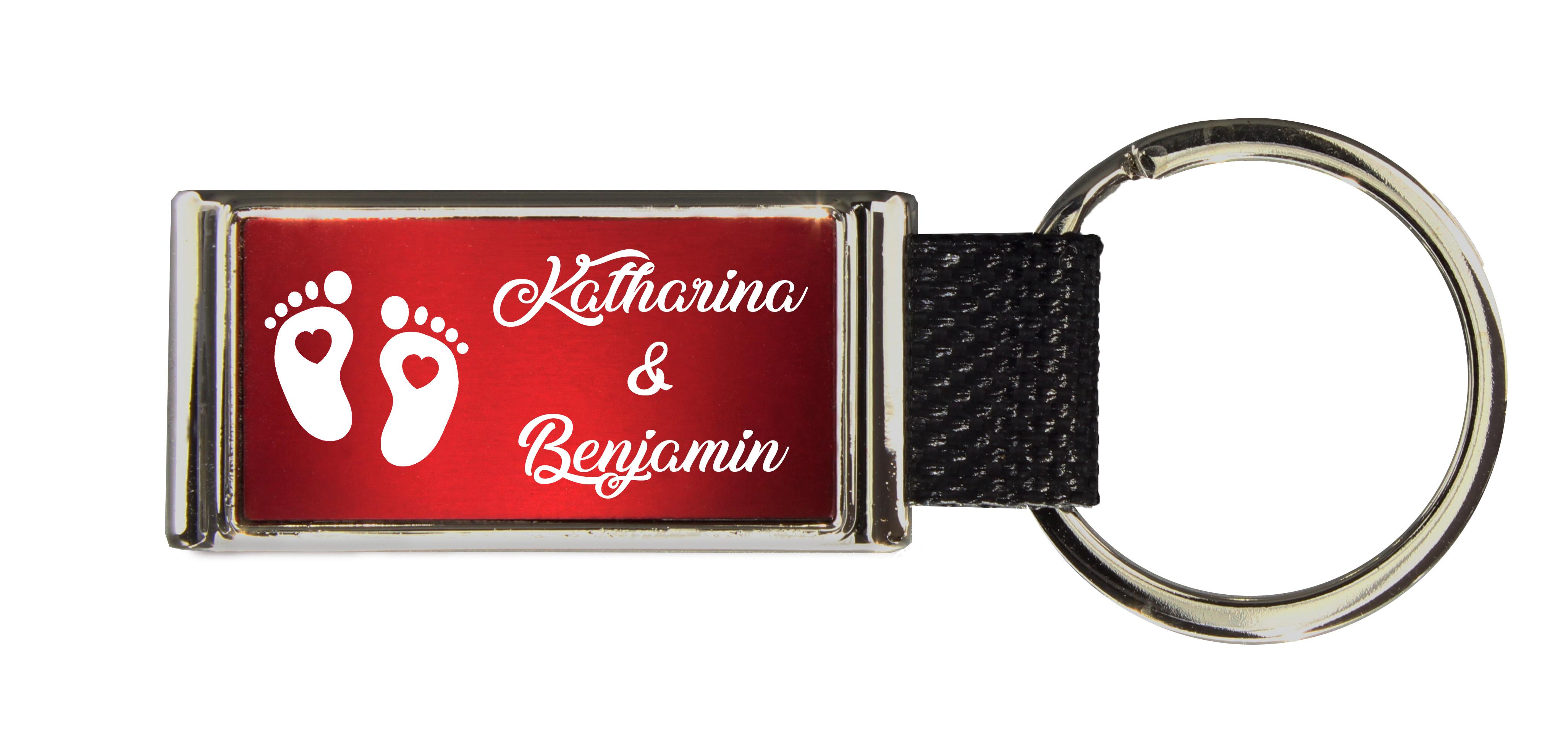 Metall-Schlüsselanhänger Glory - mit einem rot eingelassenen Plättchen und Deinen Wunschnamen graviert