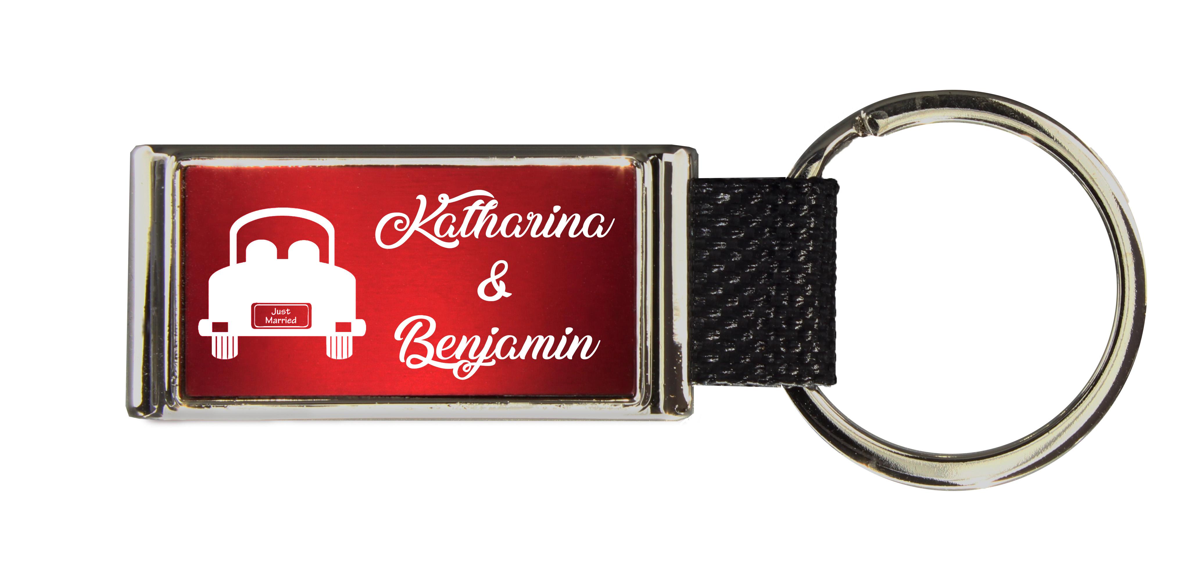 Metall-Schlüsselanhänger Glory - mit einem rot eingelassenen Plättchen und Deinen Wunschnamen graviert